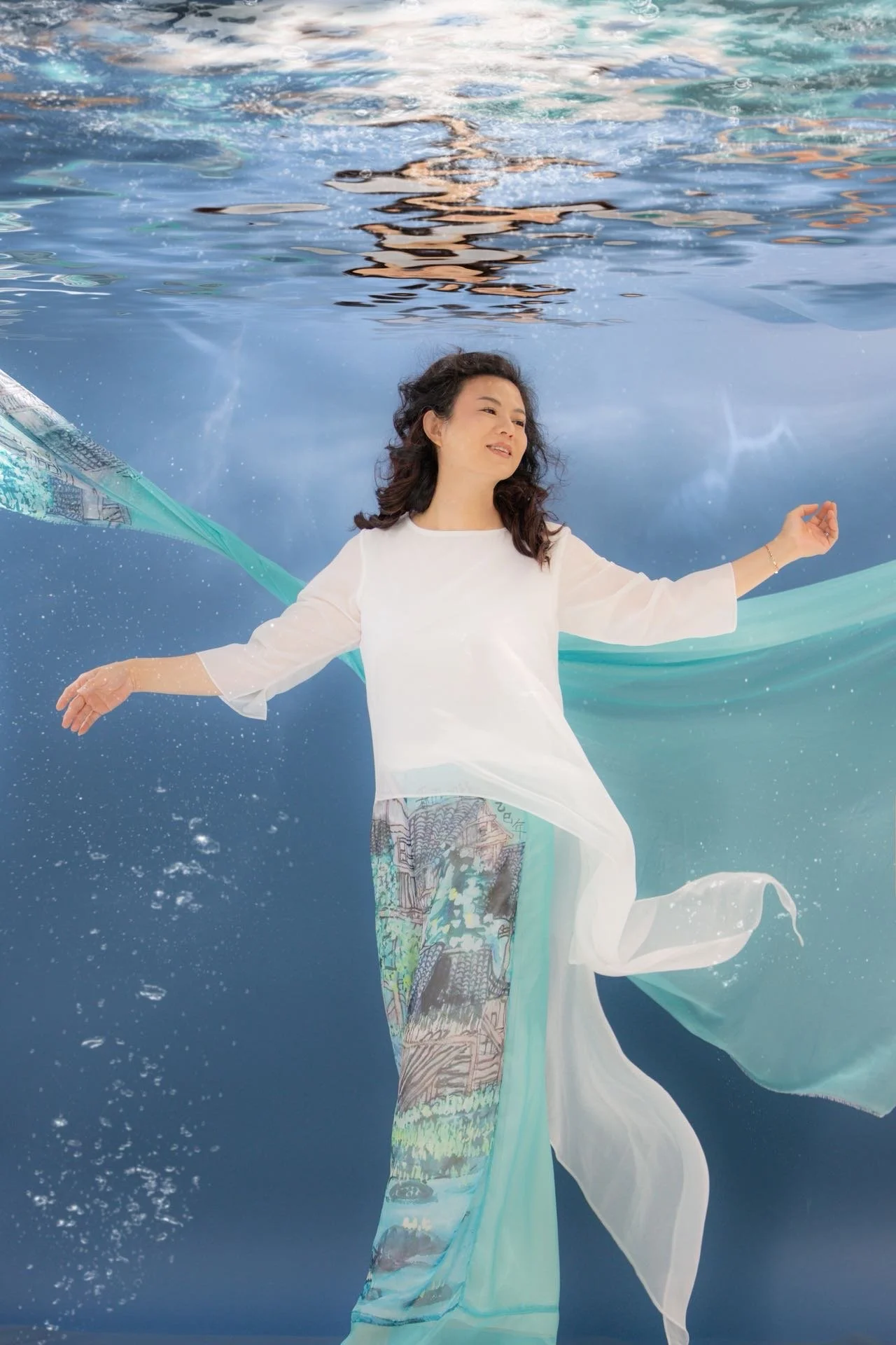 This collection inspired by Angela’s (designer’s daughter) hand-painted Chinese art. It expersses the beauty of ink landscapes from paper onto silk and organza, sparking a fashion dialogue between East and West, tradition and modernity. The collection would like to build a platform to share stories, values, and lifestyles—celebrating cultural confidence, women’s strength, and an endless journey of discovery.